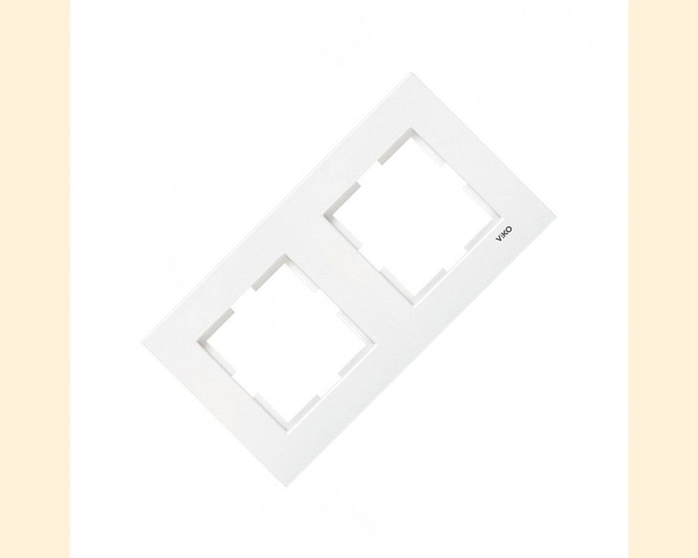 Двойная горизонтальная рамка Viko Karre белого цвета, предназначенная для объединения двух электроустановочных изделий, таких как розетки или выключатели, в один блок. Она относится к серии Karre, которая отличается минималистичным дизайном и строгими формами.