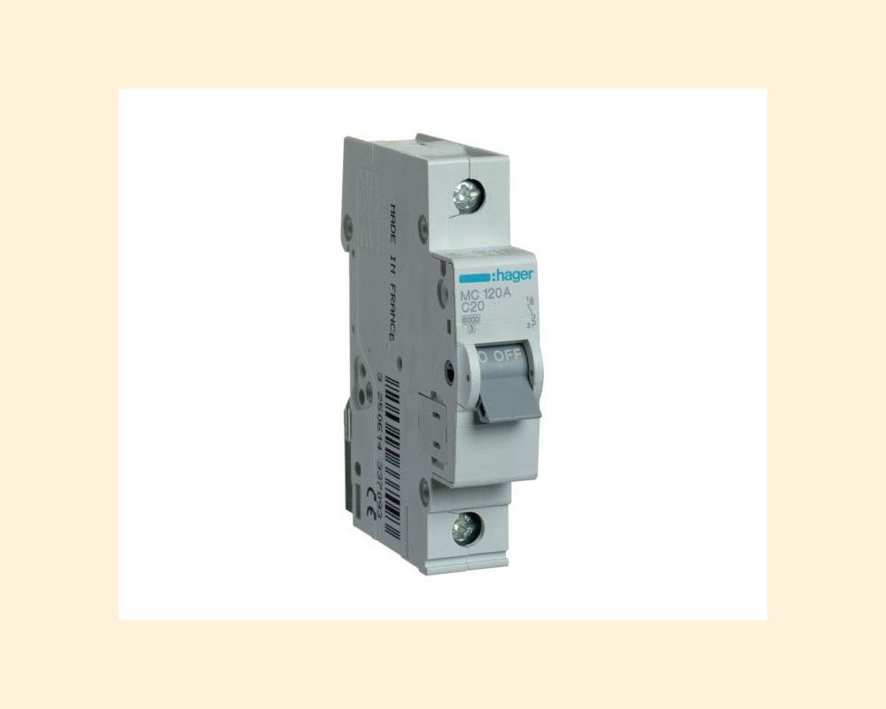 Hager MC120A — это однополюсный автоматический выключатель с номинальным током 20 А и характеристикой отключения типа C. Он предназначен для защиты электросетей от перегрузок и короткого замыкания.