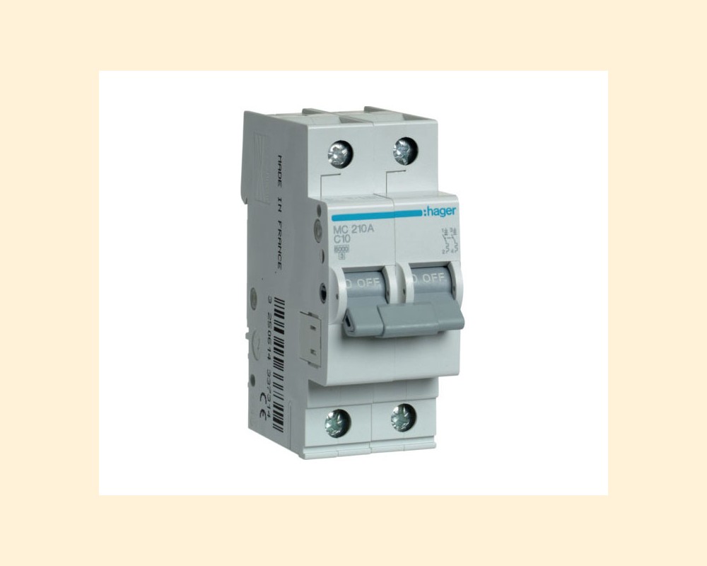 Hager MC210A — это двухполюсный автоматический выключатель, предназначенный для защиты электрических цепей от перегрузок и коротких замыканий.