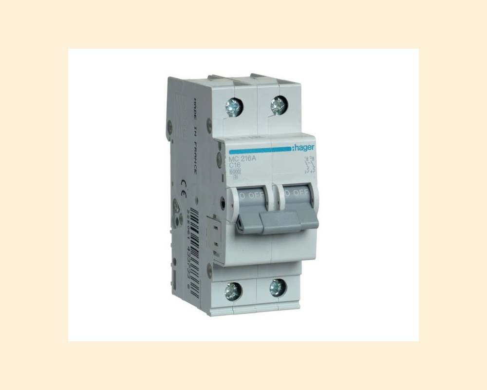 Hager MC216A — это двухполюсный автоматический выключатель, предназначенный для защиты электрических цепей от перегрузок и коротких замыканий.