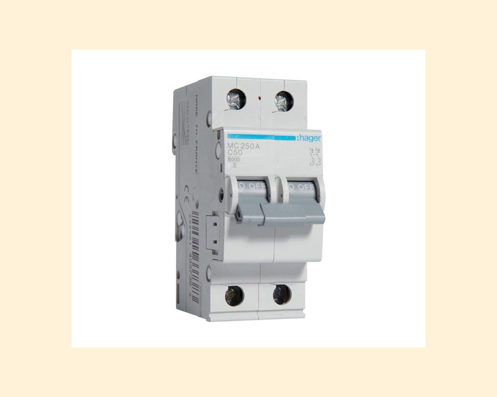 Hager MC250A — это двухполюсный автоматический выключатель, предназначенный для защиты электрических цепей от перегрузок и коротких замыканий.