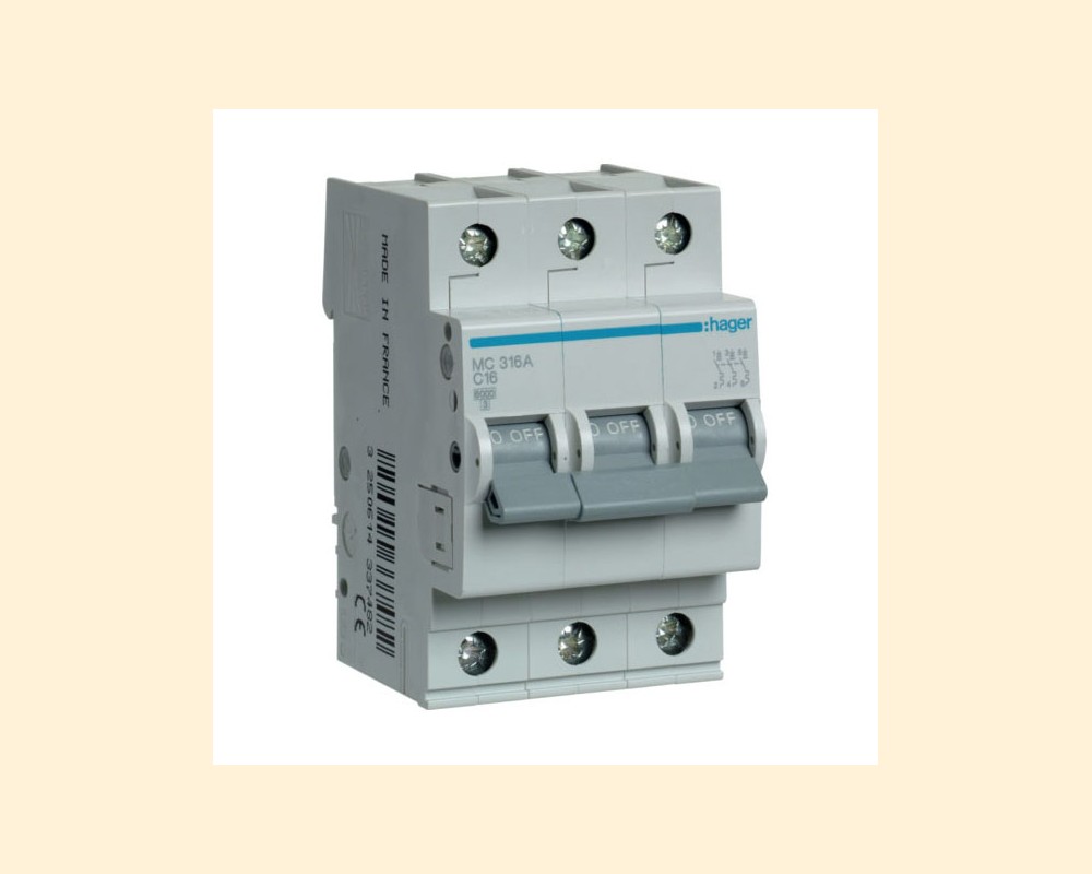 Hager MC316A — это трехполюсный автоматический выключатель, предназначенный для защиты электросетей от перегрузок и коротких замыканий.