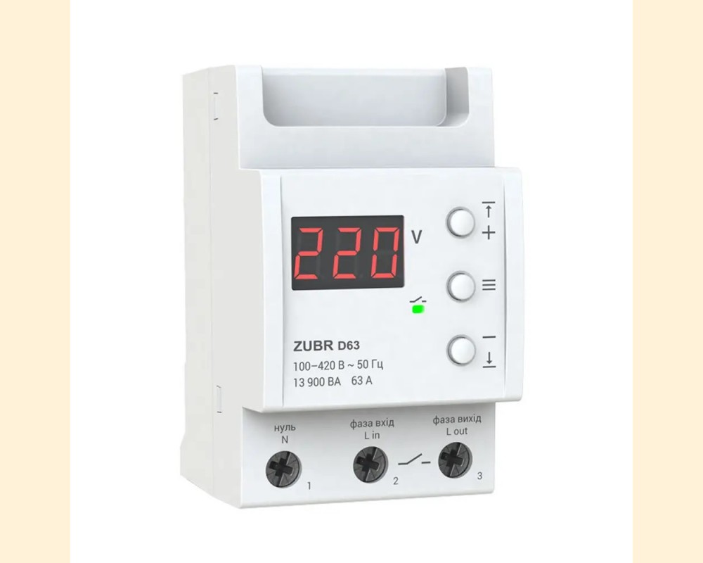 ZUBR D63 — это однофазное реле контроля напряжения, предназначенное для защиты бытовой техники и электрооборудования от критических перепадов напряжения в сети.