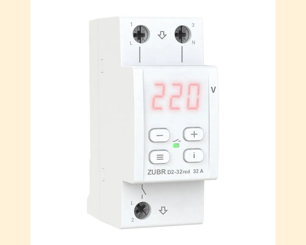 ZUBR D2-32red — это однофазное реле напряжения, предназначенное для защиты электрооборудования от критических перепадов напряжения и обрыва нуля. Устройство компактно и занимает два стандартных модуля в щитке.