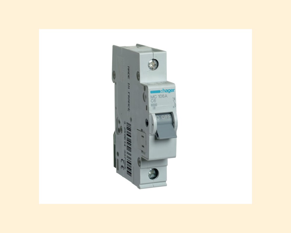 Hager MC106A – це однополюсний автоматичний вимикач з номінальним струмом 6 А та характеристикою відключення типу C. Він призначений для захисту електромереж від перевантажень та короткого замикання.