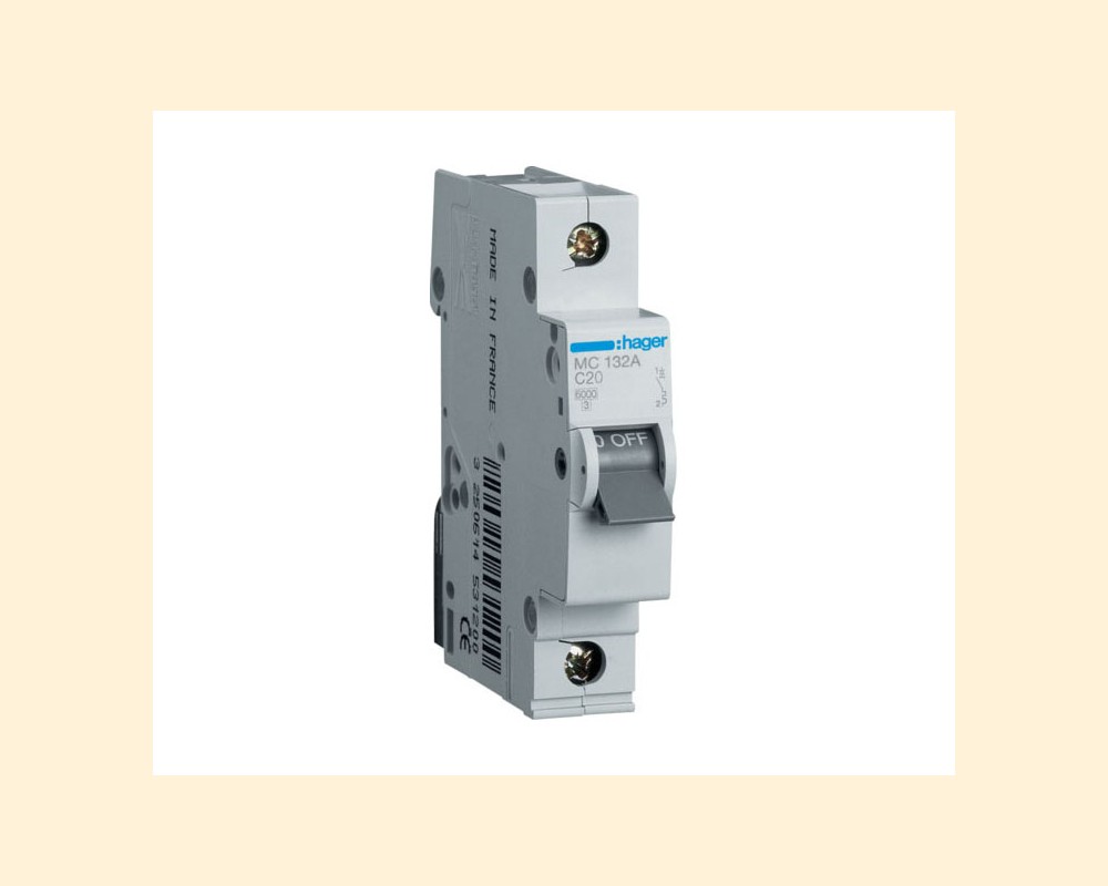 Hager MC132A – це однополюсний автоматичний вимикач з номінальним струмом 32 А та характеристикою відключення типу C. Він призначений для захисту електромереж від перевантажень та короткого замикання.