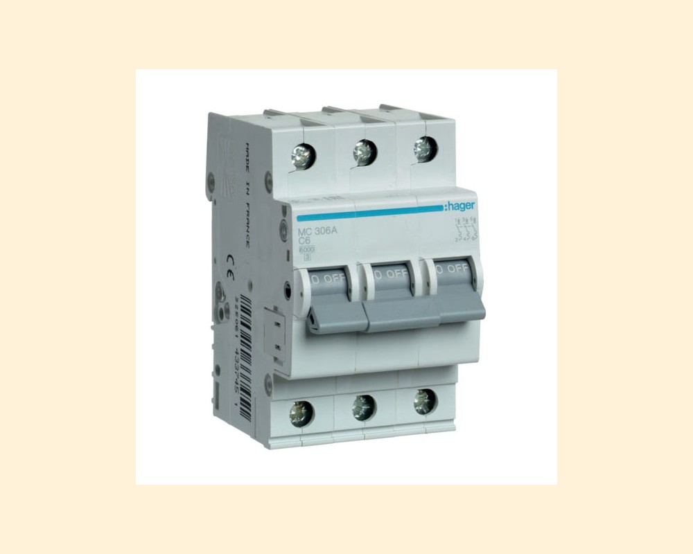 Hager MC306A – це триполюсний автоматичний вимикач, призначений для захисту електромереж від перевантажень та коротких замикань.Основні характеристики:Тип: автоматичний вимикач.Номінальний струм: 6 А.Кількість полюсів: 3.Характеристика спрацьовування: C.Номінальна напруга: 230/400 В.Номінальна здатність, що відключає: 6 кА.Монтаж на DIN-рейку.Застосування: захист кабелів та проводів у трифазній мережі.