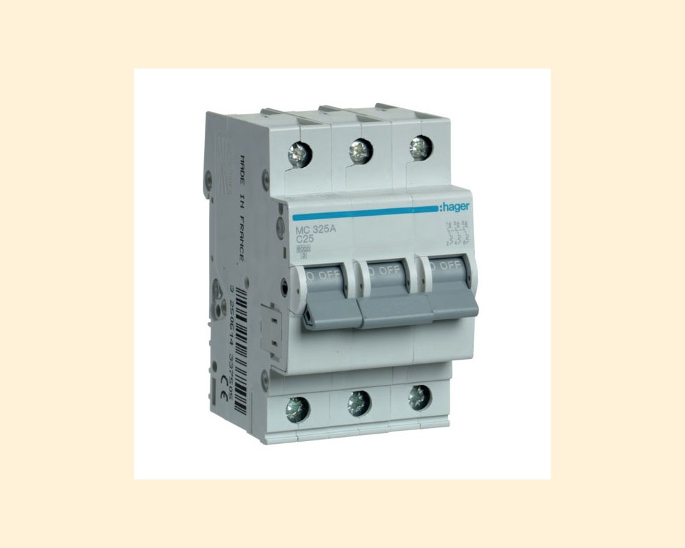 Hager MC325A – це триполюсний автоматичний вимикач, призначений для захисту електромереж від перевантажень та коротких замикань.Основні характеристики:Тип: автоматичний вимикач.Номінальний струм: 25 А.Кількість полюсів: 3.Характеристика спрацьовування: C.Номінальна напруга: 230/400 В.Номінальна здатність, що відключає: 6 кА.Монтаж на DIN-рейку.Застосування: захист кабелів та проводів у трифазній мережі.