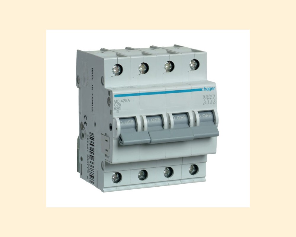 Автоматичний вимикач Hager MC425A – це чотириполюсний модульний автоматичний вимикач, призначений для захисту електричних мереж від перевантажень та коротких замикань.Основні характеристикиНомінальний струм: 25 А.Кількість полюсів: 4 (3 фази + нейтраль).Призначення: Використовується для одночасної комутації трьох фаз та нульового дроту у ланцюгах змінного струму.Характеристика вимкнення: Тип C.Вимикальна здатність: 6 кА