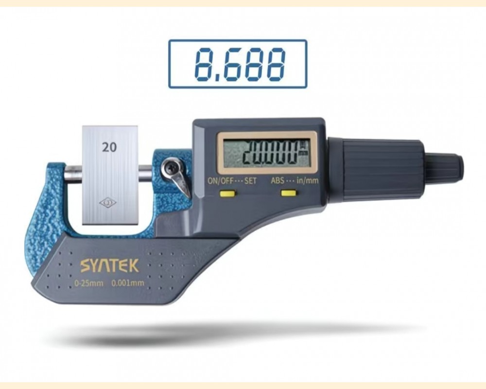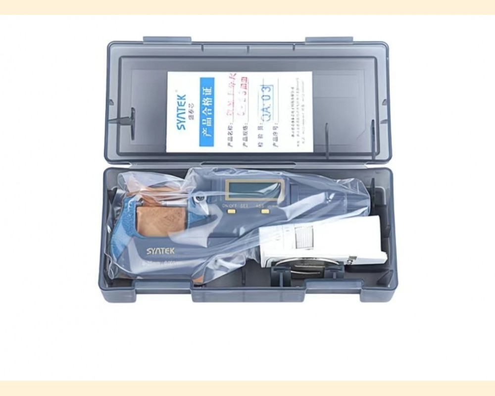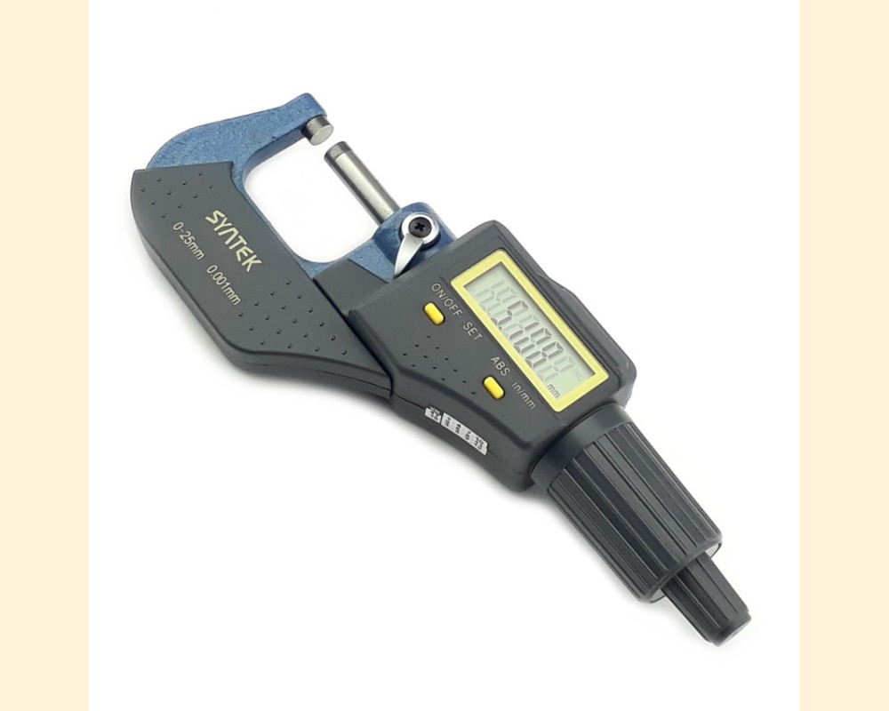 Електронний мікрометр Syntek MT-55Електронний мікрометр Syntek MT-55 – це вимірювальний інструмент, призначений для високоточних вимірювань зовнішніх розмірів із використанням цифрового дисплея.Основні характеристики Діапазон вимірів: 0-25 мм.Точність: 0,001 мм.Матеріали: Виготовлений з легованої сталі та ABS-пластику, що забезпечує міцність та довговічність.Особливості: Рідкокристалічний дисплей (LCD) для зручного та інтуїтивно зрозумілого зчитування результатів. Кнопкове керування дозволяє перемикатися між метричною та дюймовою системами вимірювань. Оснащений механічним фіксатором для блокування шкали. Наконечники вимірювального штока мають зносостійкі твердосплавні накладки.