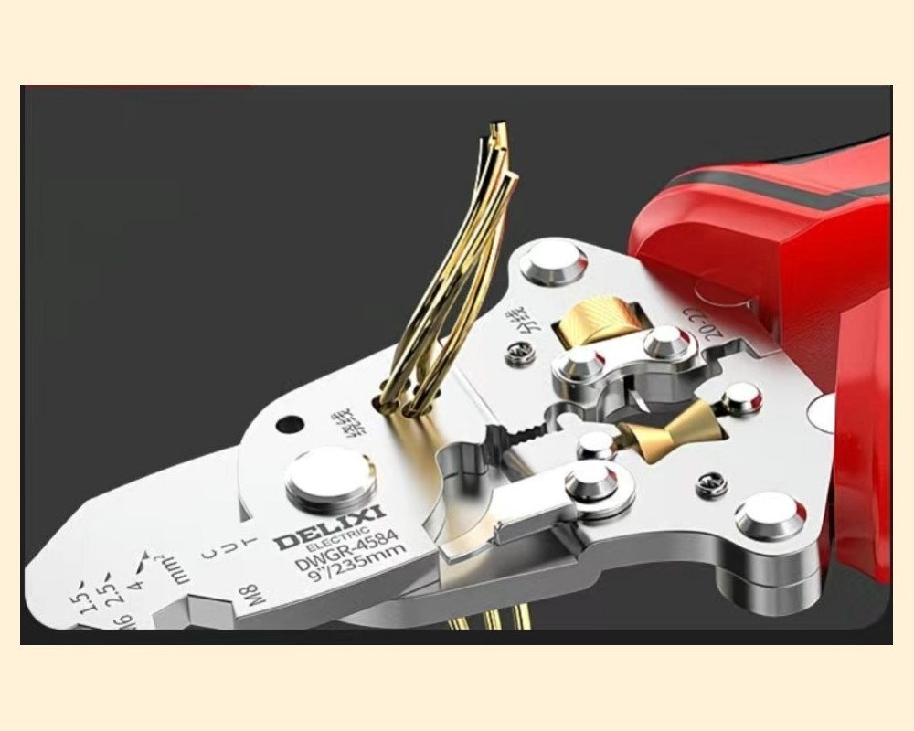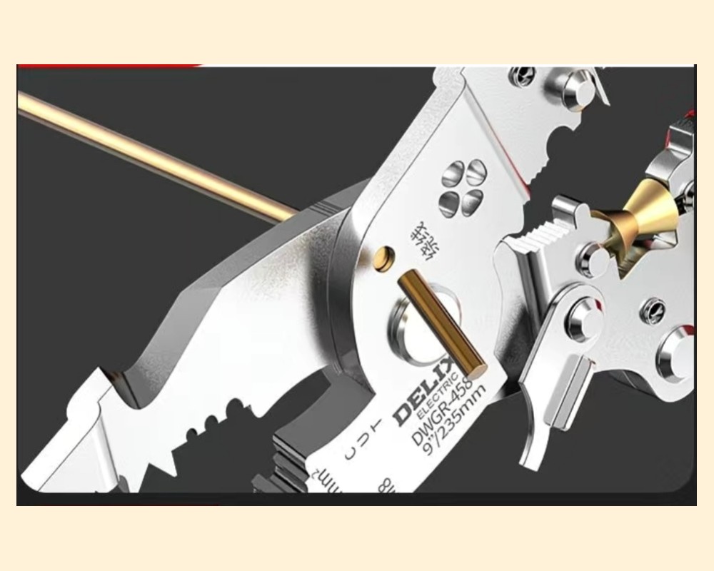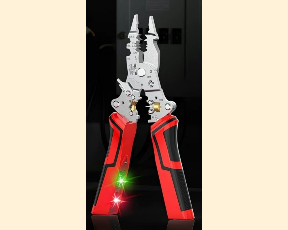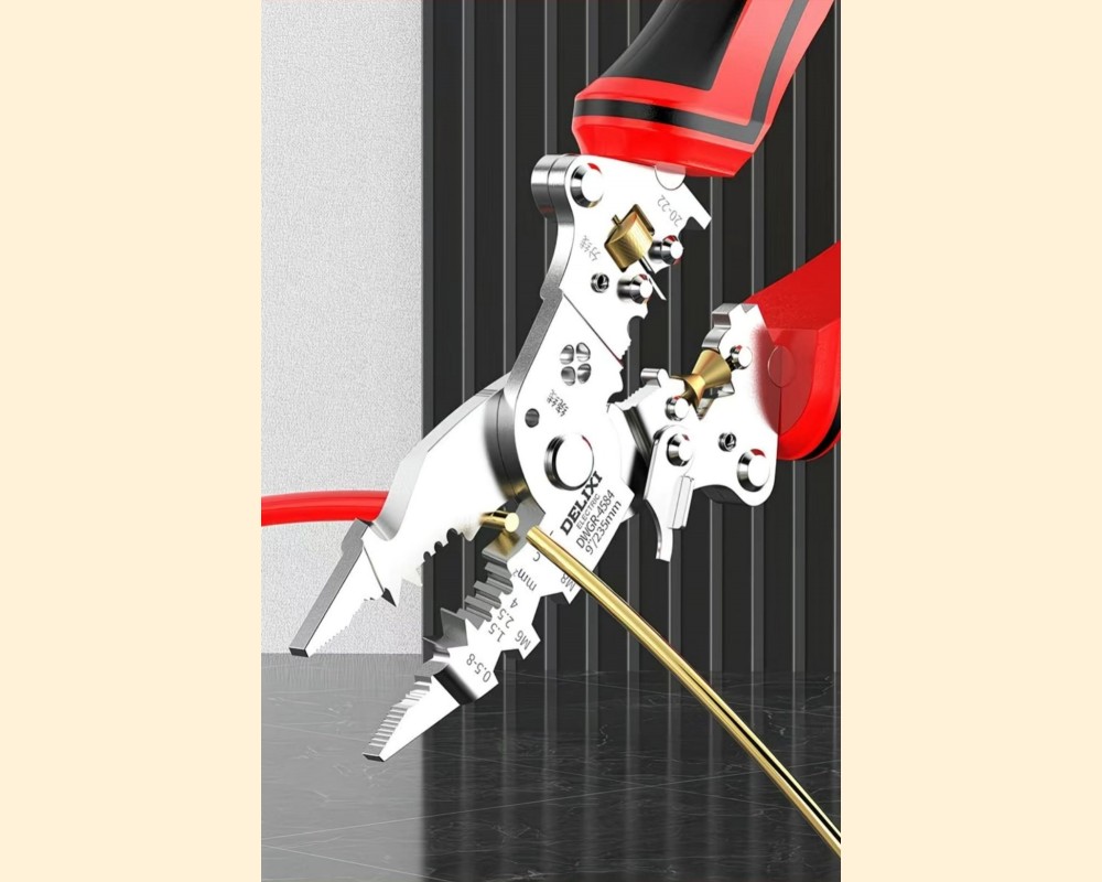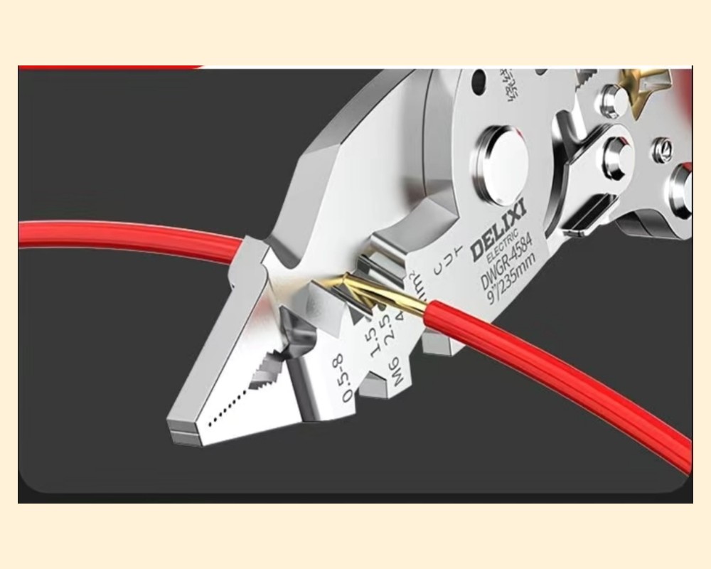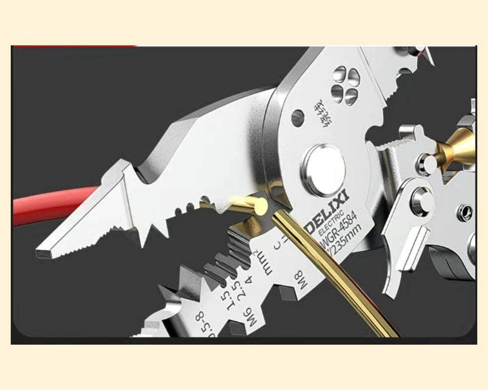 Багатофункціональні плоскогубці Delixi DWGR-4584 Це багатофункціональний інструмент від бренду Delixi Electric, який поєднує функції плоскогубців і тестера напруги. Основні функції та особливості Тестер напруги: Ручка інструменту виконує роль тестера напруги. Вона може визначати наявність змінного та постійного струму в діапазоні 12-250В. Багатофункціональність: Інструмент призначений для виконання різних завдань, включаючи зачистку, обрізання, обтискання проводів та кабелів, а також може використовуватись як ключ для болтів (M6, M8). Матеріал: Виготовлений із високоякісної хромованадієвої або високовуглецевої сталі для забезпечення міцності та довговічності. Рукоятка виконана з нековзного матеріалу TPR. Безпека: В інструкції із застосування вказано, що інструмент не є ізольованим, тому його не можна використовувати під час роботи під напругою. Тестер напруги призначений лише для екстрених ситуацій, і для його використання необхідно торкатися долонею контактного майданчика на кінці ручки.
