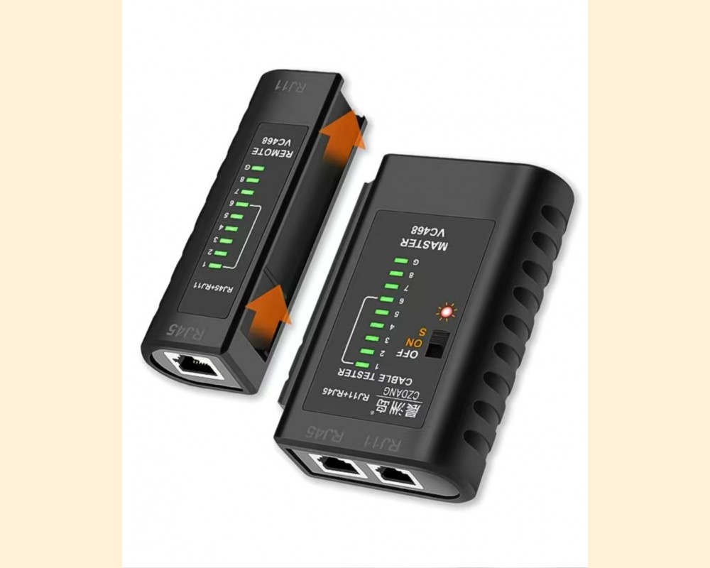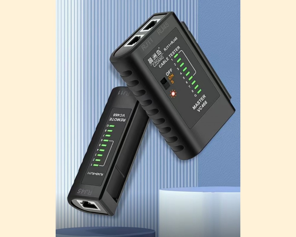 Кабельний тестер MASTER VC468, який використовується для перевірки мережевих кабелів та телефонних ліній. Він призначений для тестування цілісності дротів, наявності урвища або короткого замикання. Основні особливості: Сумісність: Підтримує кабелі з роз'ємами RJ45 (для інтернет-мереж) та RJ11 (для телефонних ліній). Конструкція: Складається з двох частин: основного блоку (MASTER) та віддаленого (REMOTE). Це дозволяє перевіряти кабелі, що вже прокладені в стінах або на великих відстанях, підключаючи по одному блоку до кожного кінця. Живлення: Пристрій працює від батареї типу «Крона» 9 ст. Індикація: Результати перевірки відображаються за допомогою світлодіодних індикаторів на обох частинах приладу, кожен з яких відповідає певному дроту.